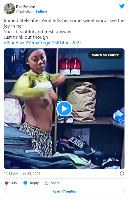 “Blue Aiva just undressed casually. see firm boobs. my eyes are fed” a netizen who identified himself as Femi wrote on Twitter.