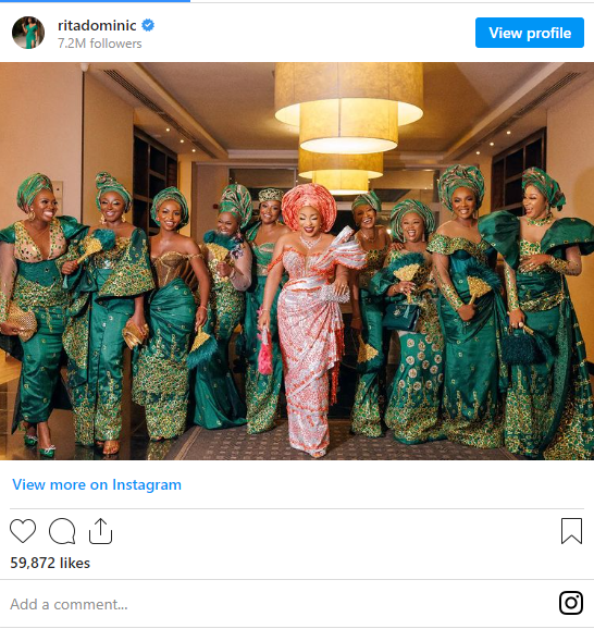 Rita wore three beautiful custom-made outfits from Tubo but much more than Rita Dominic, her guests slayed their aso-ebi attire. Everything they wore was a 100% hit. Everyone slayed. Their beautiful attires took over the internet and everyone marvelled at what a beautiful bride Rita was. Not to mention, brides recreated her look.