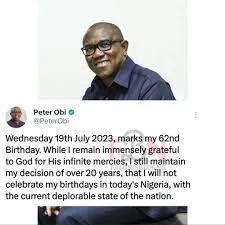 On Monday, Peter Obi revealed in a personally signed message on his Twitter page that he would be turning 62 on Wednesday, July 19th, 2023, and that several of his fans, including members of the obedient family and the Labour Party, had been pressuring him about celebrating his birthday.