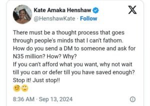 She wrote, "There must be a thought process that goes through people's minds that I can't fathom. How do you send a DM to someone and ask for N35 million? How? Why? If you can't afford what you want, why not wait till you can or defer till you have saved enough? Stop it! Just stop!!"