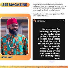 Taking to social media, Noble asked attendees to record and send him videos of any guests caught in the act, emphasizing that this habit—particularly among Igbo men—is disrupting well-organized wedding receptions.