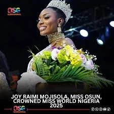 In a dazzling grand finale held in Lagos this past weekend, Joy Raimi Mojisola, a 24-year-old beauty queen from Osun State, was crowned Miss World Nigeria 2025. The highly competitive contest saw 37 contestants from all over Nigeria, but it was Raimi who stood out in the final round, clinching the coveted title after a riveting battle with the likes of Miss Ebonyi, Miss Abuja, Miss Abia, and Miss Imo.