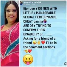 "Ejor ooo why do men with little/manageable sexual performance cheat gan na. Are dey trying to confirm their disability or… Askin for a friend of a friend. I’ll be in the comment section."