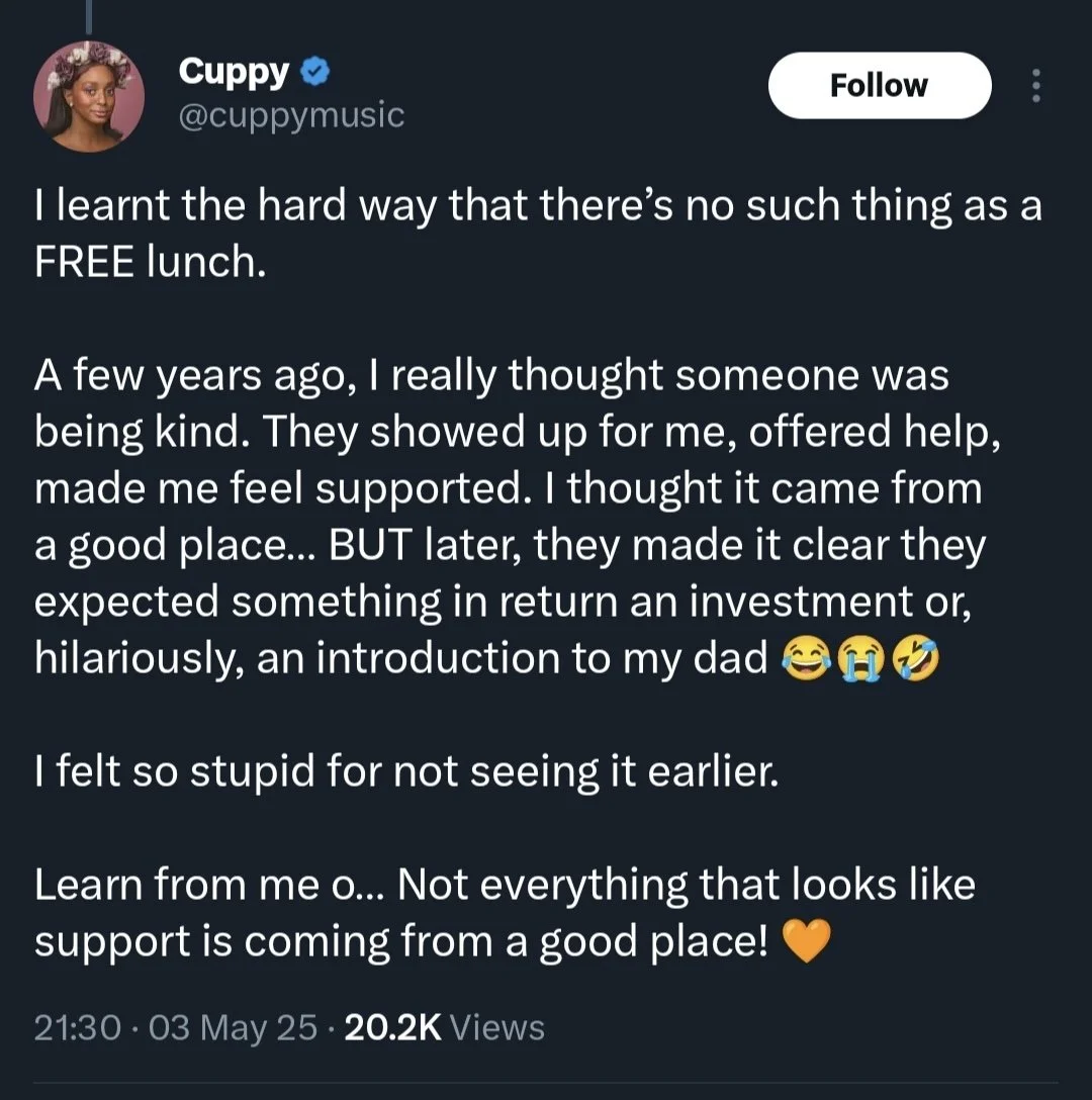 In an age where clout and connections are often mistaken for relationships, Cuppy's words hit home. While ambition and collaboration are natural parts of life, genuine support should never feel like a transaction. It's essential to discern between allies and opportunists — especially when your last name is Otedola.