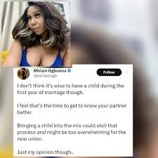 Nollywood actress Miriam Ogbonna has weighed in on marriage and family planning, suggesting that couples may want to delay having children in the first year of marriage.